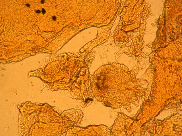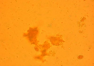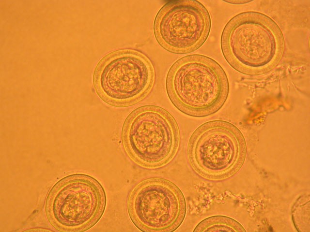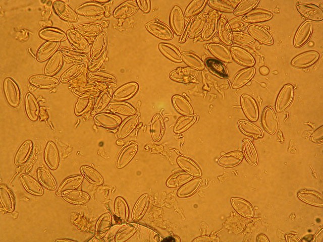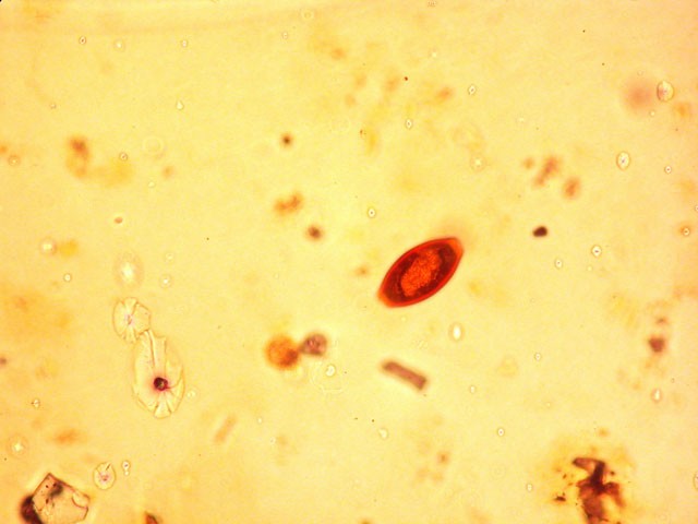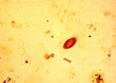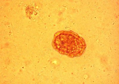 Helminti: Ascaris lumbricoides ‒ jajčece gliste v iztrebku, Lugol (60×40 µm)