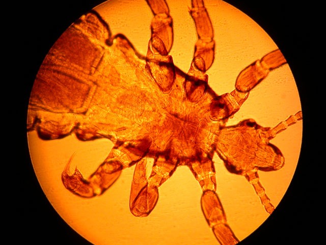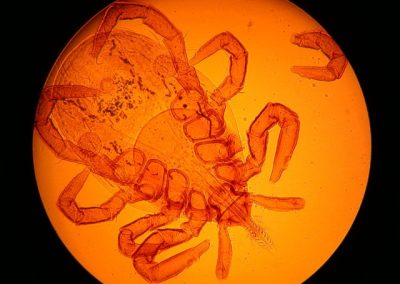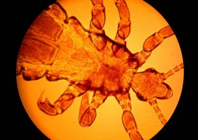 Členonožci: Sarcoptes scabiei ‒ pršica srbec v postržku kože (0,3‒0,4 mm)