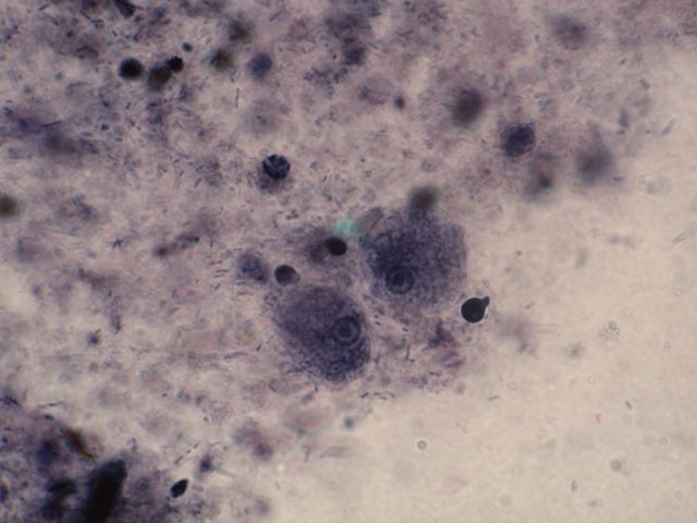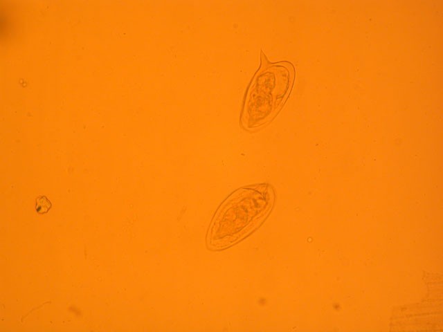 Praživali: Giardia intestinalis ‒ trofozoit v iztrebku (15×10 µm)