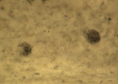 Praživali: Giardia intestinalis ‒ cista v iztrebku, Lugol (10×8 µm)