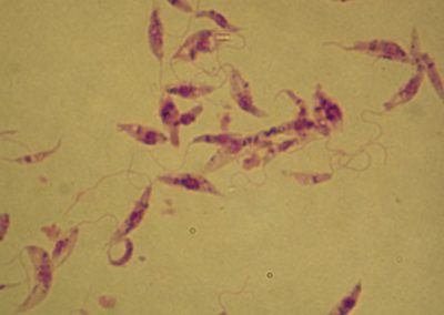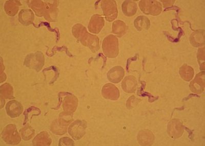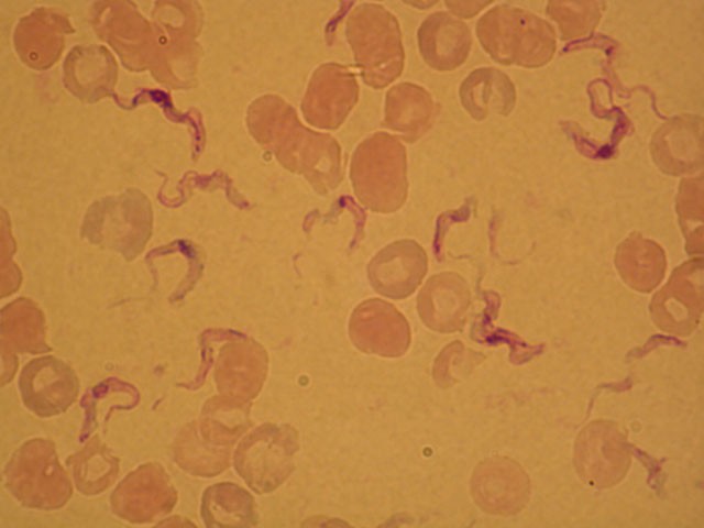 Trypanosoma brucei ‒ tripomastigotna oblika v razmazu krvi, Giemsa (25×3 µm)