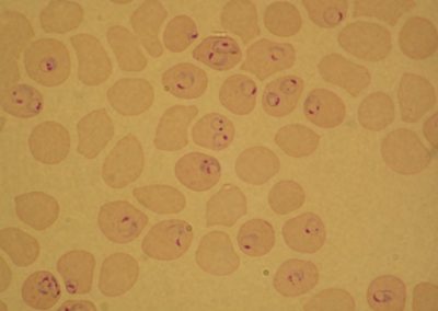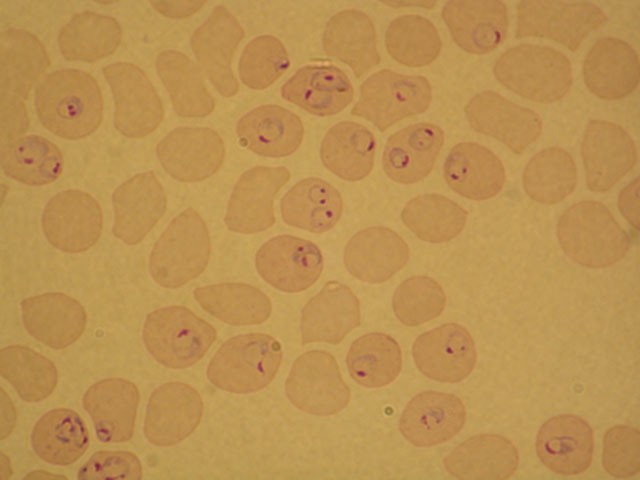 Praživali: Plasmodium falciparum – trofozoiti v eritrocitu, razmaz krvi, Giemsa (2 µm)