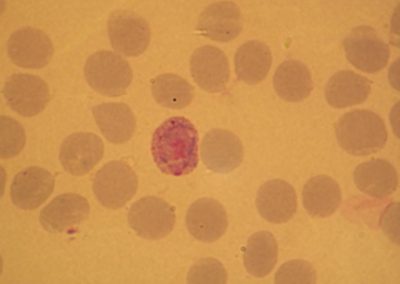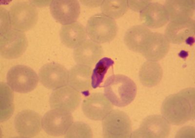 Praživali: Plasmodium vivax ‒ trofozoiti v eritrocitu, Giemsa (4 µm)