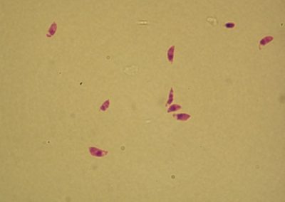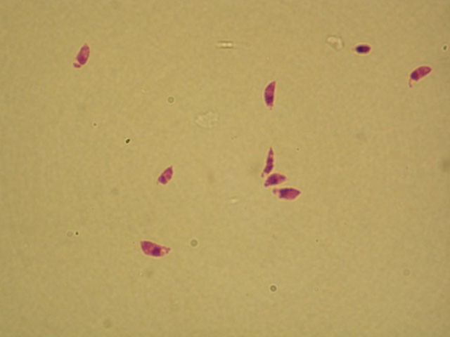 Praživali: Leishmania spp. ‒ promastigotna oblika v kulturi na NNN, Giemsa (12×2 µm)