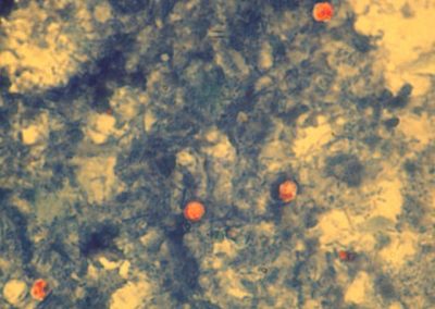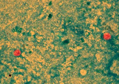 Praživali: Cyclospora cayetanensis ‒ oocista v iztrebku, Ziehl-Neelsen (9 µm)